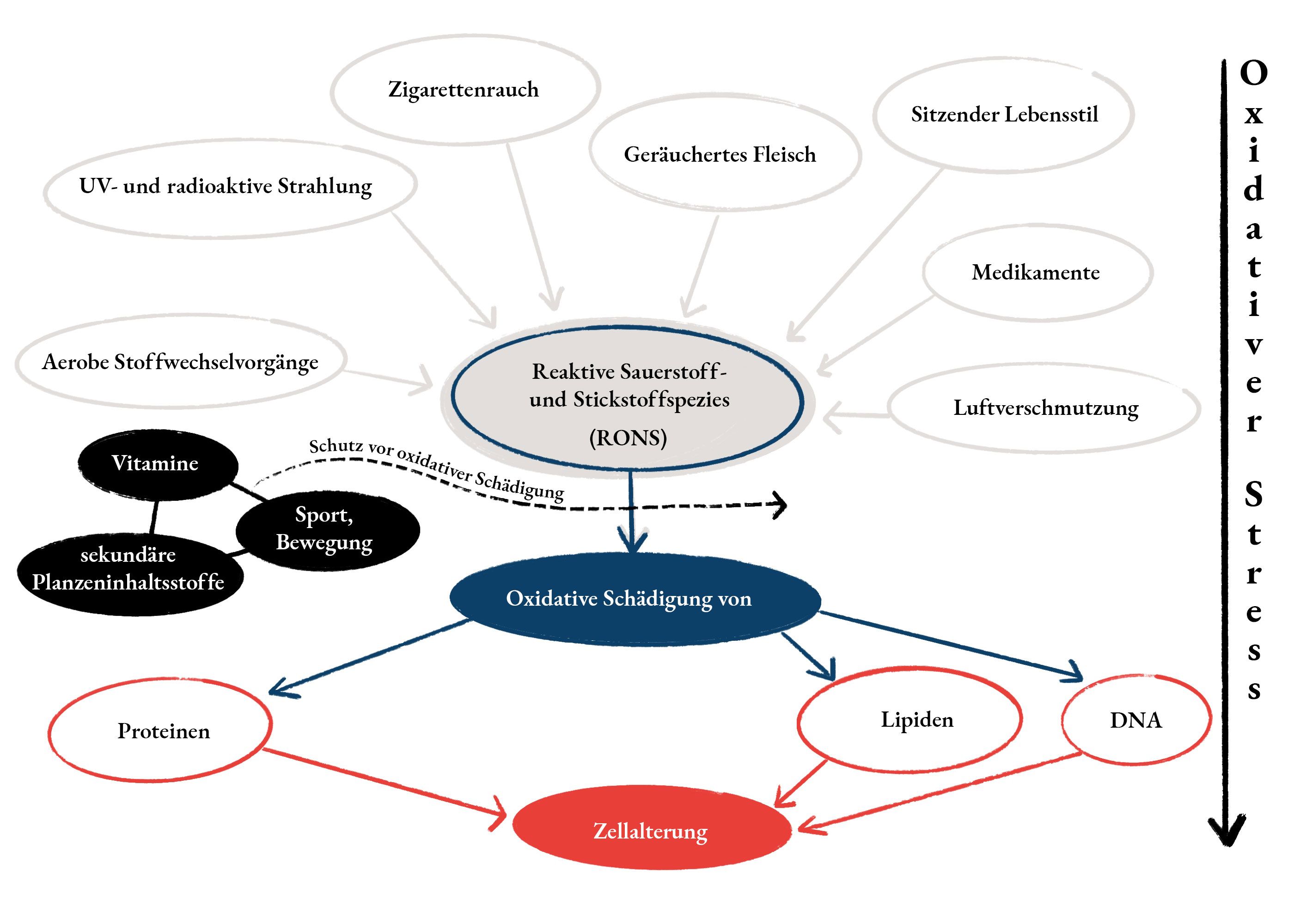 Der Alterungsprozess selbst wird nach der „Free Radical Theory of Aging“ als Zellalterung definiert, die sich durch innerzelluläre Ansammlung von Molekülen darstellt, die durch Radikale modifiziert wurden. In weiterer Folge führt diese Ansammlung modifizierter Moleküle zu einem Verlust an Gewebe und dessen Funktion (Beckman & Ames, 1998). Als Radikale werden ein oder mehrere ungepaarte Elektronen in der äußersten Hülle von Atomen oder Molekülen bezeichnet, die in aeroben Zellstoffwechselvorgängen produziert werden. Bei Stoffwechselreaktionen werden einzelne Elektronen abgegeben oder aufgenommen. Eine wichtige Rolle spielen hierbei reaktive Sauerstoff- und Stickstoffspezies, kurz RONS (Reactive Oxygen and Nitrogen Species). Bei diesen handelt es sich um radikale oder nicht radikale, äußerst reaktive Formen von Sauerstoff und Stickstoff. RONS können im Körper durch UV- und radioaktive Strahlung oder durch andere Umwelteinflüsse wie beispielsweise Zigarettenrauch, bestimmte Medikamente, einen sitzenden Lebensstil oder Speisen wie geräuchertes Fleisch entstehen. Wenn es zu einem Überschuss an RONS im Körper kommt, und dieser nicht mehr in der Lage ist, die RONS zu neutralisieren, spricht man von oxidativem Stress (Sies, 1987). Oxidativer Stress ist der Hauptgrund für die bereits erwähnten, durch Radikale modifizierten, Moleküle im Körper, die einen Gewebe- und Gewebefunktionsverlust bewirken und somit für das Altern ganz allgemein verantwortlich sind. Daraus folgt, dass Marker für oxidativen Stress auch Marker für das Altern darstellen.